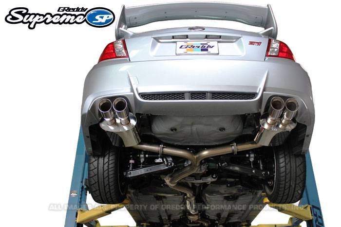 The Supreme SP for the Subaru STI Sedan features much larger diameter piping, resonators and mufflers, but also smoothes the layout for maximum performance with good sound suppression. This cat-back exhaust starts out with a full 3� mid-pipe with a large straight-through resonator to tune out drone. The next section smoothly transitions into dual 2.5� diameter piping. Improved dual GReddy straight-through mufflers with dual, double wall tips on each muffler finish off the exhaust. GReddy designers carefully position the dual mufflers and staged tips to flow with the GV-chassis� bodylines. Like all GReddy Supreme SP systems the fully hand-welded 304 Stainless-Steel exhaust carries a Limited Lifetime Warranty.