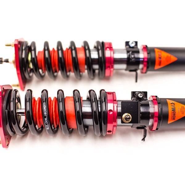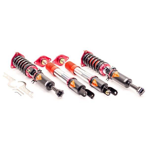 Godspeed Project's MAX is our premier single-adjustable coilover suspension kit. These coilovers are designed to be a streetable race built coilover at an affordable price. It features a monotube damper that is made out of a carbon seamless steel 52mm tube with a 44mm internal piston providing maximum damper response. The cold-bent springs are made from high strength SAE9252 steel to optimize the balance between performance and comfort. Using high quality shock oil made in Italy, Godspeed Project can guarantee exceptional damper performance at any temperature on and off the track. The top of the shock is attached to the car using a high quality top hat that features a high performance bearing pillow ball mount (when applicable). The bottom shock brackets are made out of a T7075 forged aluminum or carbon steel brackets for lighter weight without sacrificing durability which also includes brake line brackets (when applicable). The MAX offers 40 level of damper adjustability which can be set to your preference.