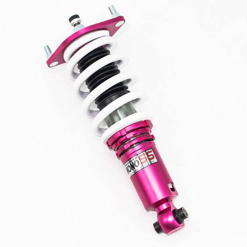 Godspeed Project's MonoSS is our one entity in our family of single-adjustable coilover suspension kits. These coilovers are designed to be a streetable race built coilover at an affordable price. It features a monotube damper that is made out of a carbon seamless steel 52mm tube with a performance internal piston providing maximum damper response. The cold-bent springs are made from high strength SAE9252 steel to optimize the balance between performance and comfort. Using race quality shock oil, Godspeed Project can guarantee exceptional damper performance at any temperature on and off the track. The top of the shock is attached to the car using a high quality top hat that features a high performance Japanese KOYO 6204Z bearing pillow ball mount (when applicable). The bottom shock brackets are made out of a T7075 forged aluminum or carbon steel brackets for lighter weight without sacrificing durability which also includes brake line brackets (when applicable). The MonoSS offers 16 level of damper adjustability which can be set to your preference.