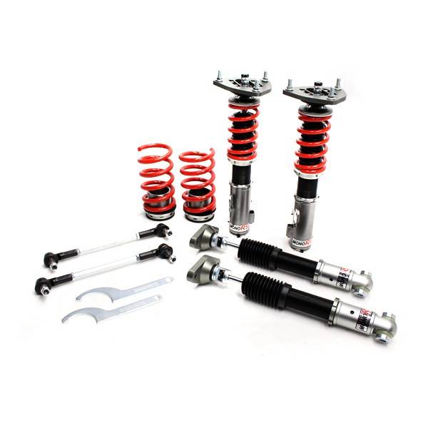 Godspeed Project's MonoRS is our one entity in our family of single-adjustable coilover suspension kits. These coilovers are designed to be a streetable race built coilover at an affordable price. It features a monotube damper that is made out of a carbon seamless steel 52mm tube with a performance internal piston providing maximum damper response. The cold-bent springs are made from high strength SAE9252 steel to optimize the balance between performance and comfort. Using race quality shock oil, Godspeed Project can guarantee exceptional damper performance at any temperature on and off the track. The top of the shock is attached to the car using a high quality top hat that features a high performance Japanese KOYO 6204Z bearing pillow ball mount (when applicable). The bottom shock brackets are made out of a T7075 forged aluminum or carbon steel brackets for lighter weight without sacrificing durability which also includes brake line brackets (when applicable). The MonoRS offers 32 level of damper adjustability which can be set to your preference.