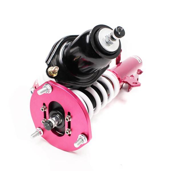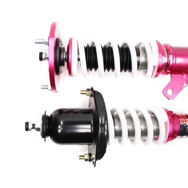Godspeed Project's MonoSS is our one entity in our family of single-adjustable coilover suspension kits. These coilovers are designed to be a streetable race built coilover at an affordable price. It features a monotube damper that is made out of a carbon seamless steel 52mm tube with a performance internal piston providing maximum damper response. The cold-bent springs are made from high strength SAE9252 steel to optimize the balance between performance and comfort. Using race quality shock oil, Godspeed Project can guarantee exceptional damper performance at any temperature on and off the track. The top of the shock is attached to the car using a high quality top hat that features a high performance Japanese KOYO 6204Z bearing pillow ball mount (when applicable). The bottom shock brackets are made out of a T7075 forged aluminum or carbon steel brackets for lighter weight without sacrificing durability which also includes brake line brackets (when applicable). The MonoSS offers 16 level of damper adjustability which can be set to your preference.
