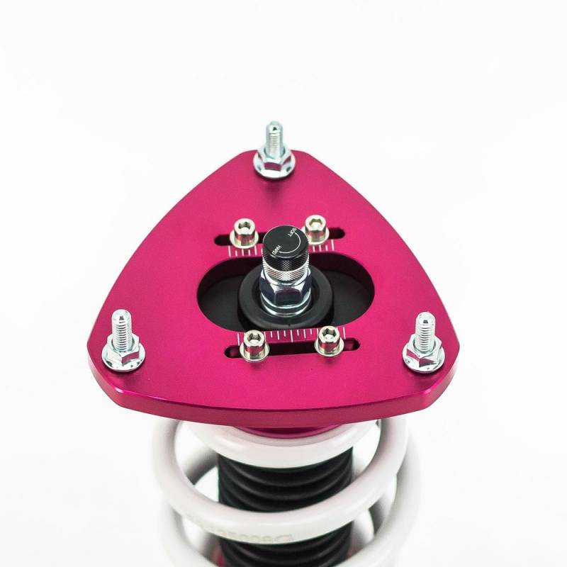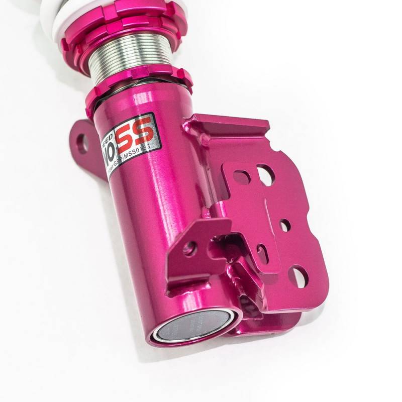 Godspeed Project's MonoSS is our one entity in our family of single-adjustable coilover suspension kits. These coilovers are designed to be a streetable race built coilover at an affordable price. It features a monotube damper that is made out of a carbon seamless steel 52mm tube with a performance internal piston providing maximum damper response. The cold-bent springs are made from high strength SAE9252 steel to optimize the balance between performance and comfort. Using race quality shock oil, Godspeed Project can guarantee exceptional damper performance at any temperature on and off the track. The top of the shock is attached to the car using a high quality top hat that features a high performance Japanese KOYO 6204Z bearing pillow ball mount (when applicable). The bottom shock brackets are made out of a T7075 forged aluminum or carbon steel brackets for lighter weight without sacrificing durability which also includes brake line brackets (when applicable). The MonoSS offers 16 level of damper adjustability which can be set to your preference.