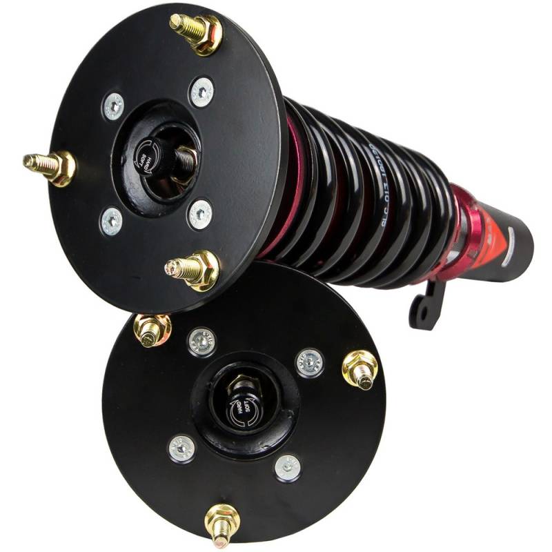 Godspeed Project's MAX is our premier single-adjustable coilover suspension kit. These coilovers are designed to be a streetable race built coilover at an affordable price. It features a monotube damper that is made out of a carbon seamless steel 52mm tube with a 44mm internal piston providing maximum damper response. The cold-bent springs are made from high strength SAE9252 steel to optimize the balance between performance and comfort. Using high quality shock oil made in Italy, Godspeed Project can guarantee exceptional damper performance at any temperature on and off the track. The top of the shock is attached to the car using a high quality top hat that features a high performance bearing pillow ball mount (when applicable). The bottom shock brackets are made out of a T7075 forged aluminum or carbon steel brackets for lighter weight without sacrificing durability which also includes brake line brackets (when applicable). The MAX offers 40 level of damper adjustability which can be set to your preference.
