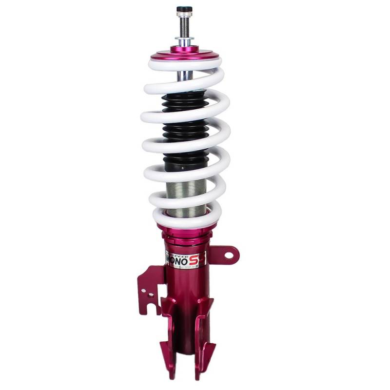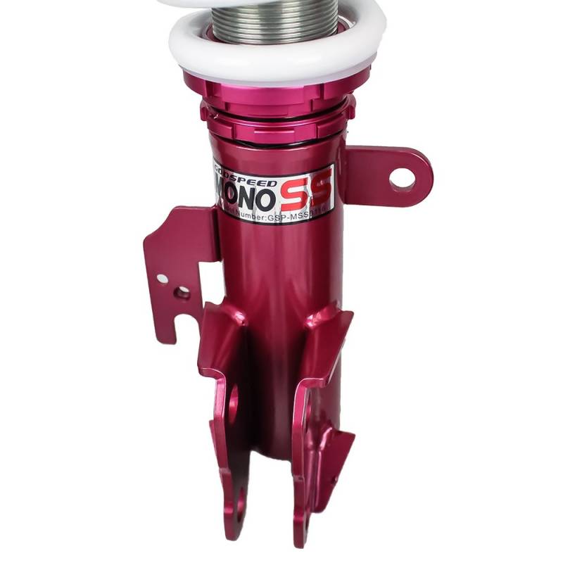 Godspeed Project's MonoSS is our one entity in our family of single-adjustable coilover suspension kits. These coilovers are designed to be a streetable race built coilover at an affordable price. It features a monotube damper that is made out of a carbon seamless steel 52mm tube with a performance internal piston providing maximum damper response. The cold-bent springs are made from high strength SAE9252 steel to optimize the balance between performance and comfort. Using race quality shock oil, Godspeed Project can guarantee exceptional damper performance at any temperature on and off the track. The top of the shock is attached to the car using a high quality top hat that features a high performance Japanese KOYO 6204Z bearing pillow ball mount (when applicable). The bottom shock brackets are made out of a T7075 forged aluminum or carbon steel brackets for lighter weight without sacrificing durability which also includes brake line brackets (when applicable). The MonoSS offers 16 level of damper adjustability which can be set to your preference.