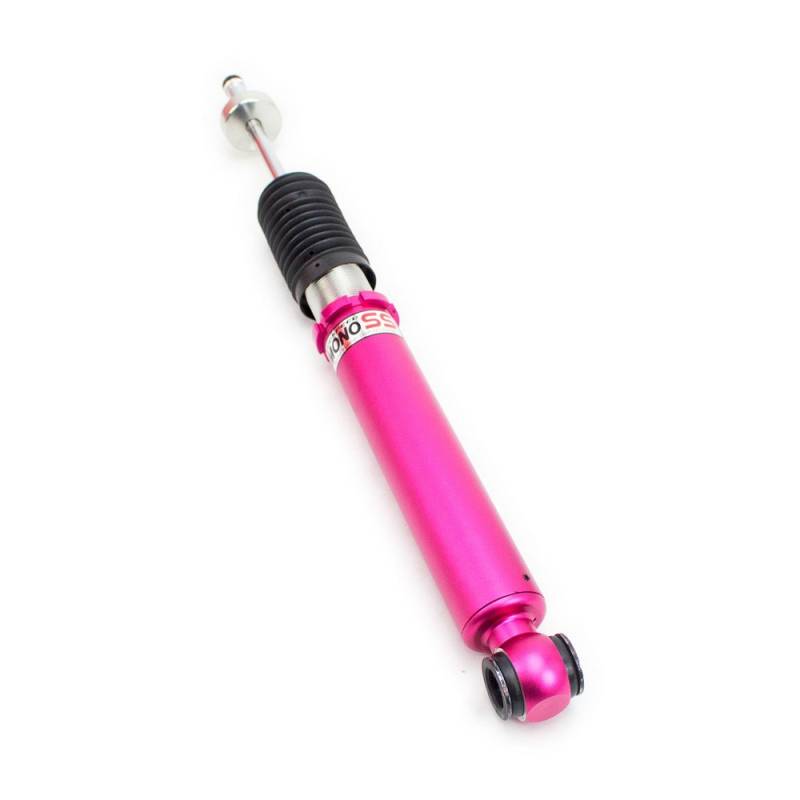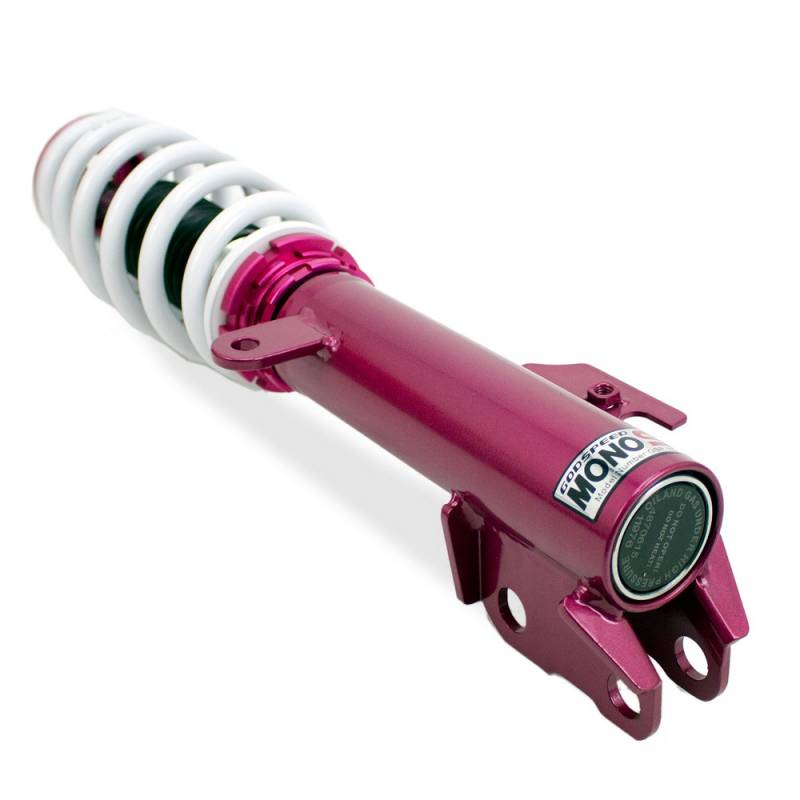 Godspeed Project's MonoSS is our one entity in our family of single-adjustable coilover suspension kits. These coilovers are designed to be a streetable race built coilover at an affordable price. It features a monotube damper that is made out of a carbon seamless steel 52mm tube with a performance internal piston providing maximum damper response. The cold-bent springs are made from high strength SAE9252 steel to optimize the balance between performance and comfort. Using race quality shock oil, Godspeed Project can guarantee exceptional damper performance at any temperature on and off the track. The top of the shock is attached to the car using a high quality top hat that features a high performance Japanese KOYO 6204Z bearing pillow ball mount (when applicable). The bottom shock brackets are made out of a T7075 forged aluminum or carbon steel brackets for lighter weight without sacrificing durability which also includes brake line brackets (when applicable). The MonoSS offers 16 level of damper adjustability which can be set to your preference.