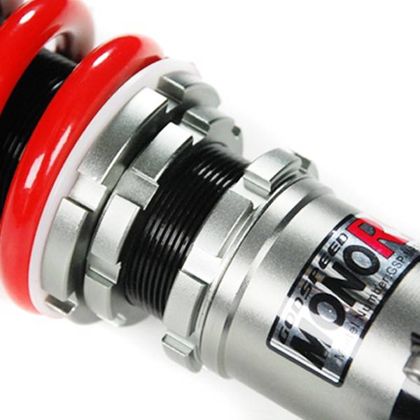 Godspeed Project's MonoRS is our one entity in our family of single-adjustable coilover suspension kits. These coilovers are designed to be a streetable race built coilover at an affordable price. It features a monotube damper that is made out of a carbon seamless steel 52mm tube with a performance internal piston providing maximum damper response. The cold-bent springs are made from high strength SAE9252 steel to optimize the balance between performance and comfort. Using race quality shock oil, Godspeed Project can guarantee exceptional damper performance at any temperature on and off the track. The top of the shock is attached to the car using a high quality top hat that features a high performance Japanese KOYO 6204Z bearing pillow ball mount (when applicable). The bottom shock brackets are made out of a T7075 forged aluminum or carbon steel brackets for lighter weight without sacrificing durability which also includes brake line brackets (when applicable). The MonoRS offers 32 level of damper adjustability which can be set to your preference.