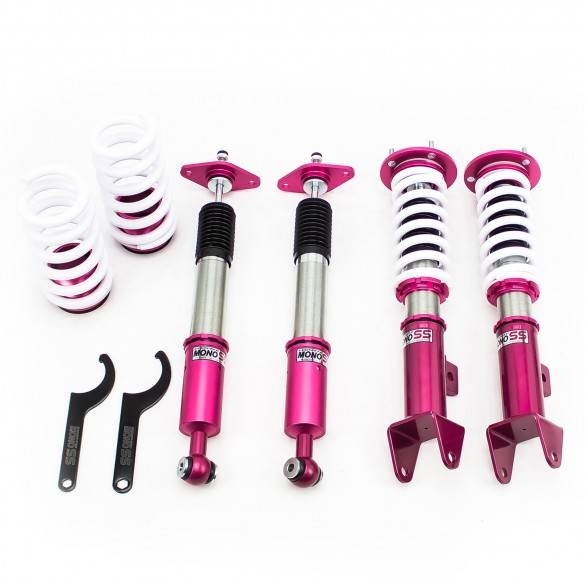 Godspeed Project's MonoSS is our one entity in our family of single-adjustable coilover suspension kits. These coilovers are designed to be a streetable race built coilover at an affordable price. It features a monotube damper that is made out of a carbon seamless steel 52mm tube with a performance internal piston providing maximum damper response. The cold-bent springs are made from high strength SAE9252 steel to optimize the balance between performance and comfort. Using race quality shock oil, Godspeed Project can guarantee exceptional damper performance at any temperature on and off the track. The top of the shock is attached to the car using a high quality top hat that features a high performance Japanese KOYO 6204Z bearing pillow ball mount (when applicable). The bottom shock brackets are made out of a T7075 forged aluminum or carbon steel brackets for lighter weight without sacrificing durability which also includes brake line brackets (when applicable). The MonoSS offers 16 level of damper adjustability which can be set to your preference.