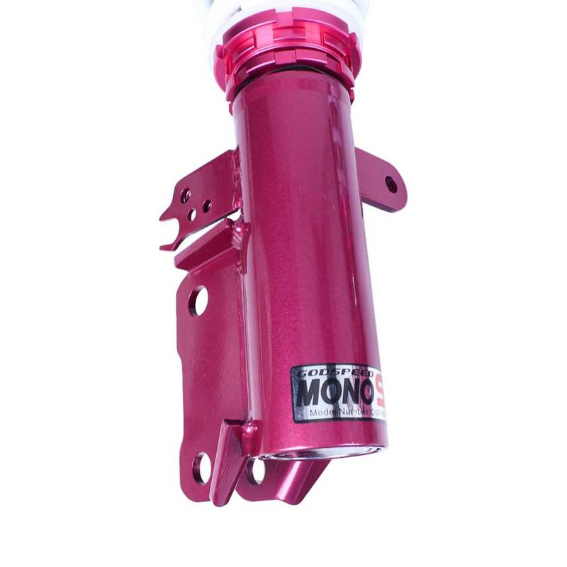 Godspeed Project's MonoSS is our one entity in our family of single-adjustable coilover suspension kits. These coilovers are designed to be a streetable race built coilover at an affordable price. It features a monotube damper that is made out of a carbon seamless steel 52mm tube with a performance internal piston providing maximum damper response. The cold-bent springs are made from high strength SAE9252 steel to optimize the balance between performance and comfort. Using race quality shock oil, Godspeed Project can guarantee exceptional damper performance at any temperature on and off the track. The top of the shock is attached to the car using a high quality top hat that features a high performance Japanese KOYO 6204Z bearing pillow ball mount (when applicable). The bottom shock brackets are made out of a T7075 forged aluminum or carbon steel brackets for lighter weight without sacrificing durability which also includes brake line brackets (when applicable). The MonoSS offers 16 level of damper adjustability which can be set to your preference.