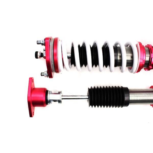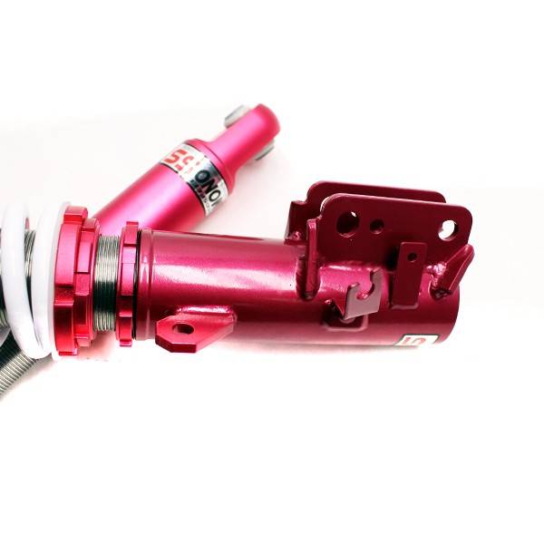 Godspeed Project's MonoSS is our one entity in our family of single-adjustable coilover suspension kits. These coilovers are designed to be a streetable race built coilover at an affordable price. It features a monotube damper that is made out of a carbon seamless steel 52mm tube with a performance internal piston providing maximum damper response. The cold-bent springs are made from high strength SAE9252 steel to optimize the balance between performance and comfort. Using race quality shock oil, Godspeed Project can guarantee exceptional damper performance at any temperature on and off the track. The top of the shock is attached to the car using a high quality top hat that features a high performance Japanese KOYO 6204Z bearing pillow ball mount (when applicable). The bottom shock brackets are made out of a T7075 forged aluminum or carbon steel brackets for lighter weight without sacrificing durability which also includes brake line brackets (when applicable). The MonoSS offers 16 level of damper adjustability which can be set to your preference.