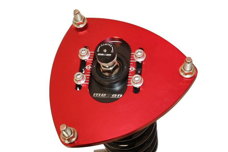 On applications utilizing strut-type suspension designs, the Megan Racing Damper Kits come with fully adjustable Pillow-Ball upper mount camber plates to easily tune and adjust your camber, giving you a competitive edge over other suspension setups. This allows you to tune your car for any ride height and still adjust camber to improve handling, vehicle predictability and tire wear, which is a great benefit both on the race-track and on the street.