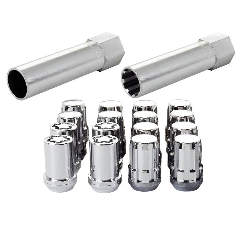 The convenient way to order Tuner wheel locks and lug nuts; contains all the wheel locks and lug nuts that you need to install 4 wheels and tires.; Why settle for ordinary lug nuts? SplineDrive Lug Nuts combine style and performance.; A no-compromise design engineered to fit small diameter recesses in Tuner style wheels.; SplineDrive lug nuts offer closed-end design, maximum gripping power, more stud engagement and a greater seating surface than socket style lug nuts.; In addition they are 30% lighter in weight.; Like all McGard lug nuts, the chrome plating is guaranteed for life not to rust, chip or peel.; The easy-to-use, one-piece wheel locks function like regular lug nuts, but require a special key tool for installation and removal.; The computer generated key designs allow for an infinite number of key patterns.; McGard manufactures wheel locks and lug nuts in the USA to meet or exceed O.E.M.; standards for safety and durability.; Every lug nut and wheel lock is fully machined from restricted chemistry steel made specifically for McGard and through-hardened for its unsurpassed level of safety.; For use on aluminum cone seat wheels only.; Clamshell Packaging.; This product may contain globally sourced materials/components.