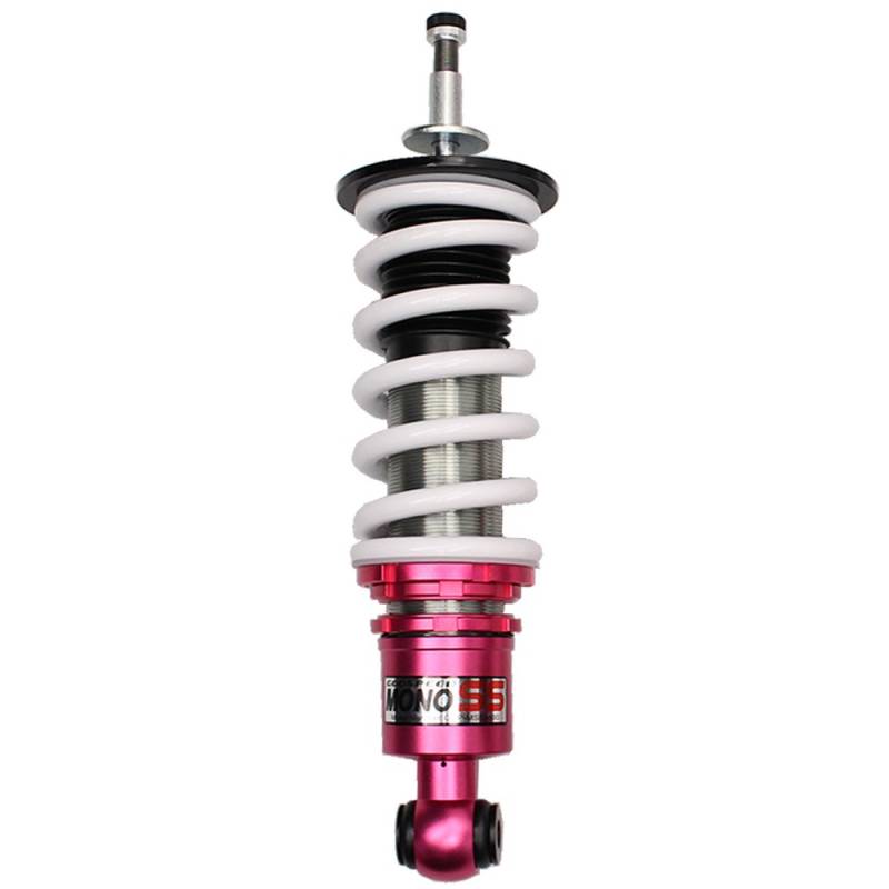 Godspeed Project's MonoSS is our one entity in our family of single-adjustable coilover suspension kits. These coilovers are designed to be a streetable race built coilover at an affordable price. It features a monotube damper that is made out of a carbon seamless steel 52mm tube with a performance internal piston providing maximum damper response. The cold-bent springs are made from high strength SAE9252 steel to optimize the balance between performance and comfort. Using race quality shock oil, Godspeed Project can guarantee exceptional damper performance at any temperature on and off the track. The top of the shock is attached to the car using a high quality top hat that features a high performance Japanese KOYO 6204Z bearing pillow ball mount (when applicable). The bottom shock brackets are made out of a T7075 forged aluminum or carbon steel brackets for lighter weight without sacrificing durability which also includes brake line brackets (when applicable). The MonoSS offers 16 level of damper adjustability which can be set to your preference.