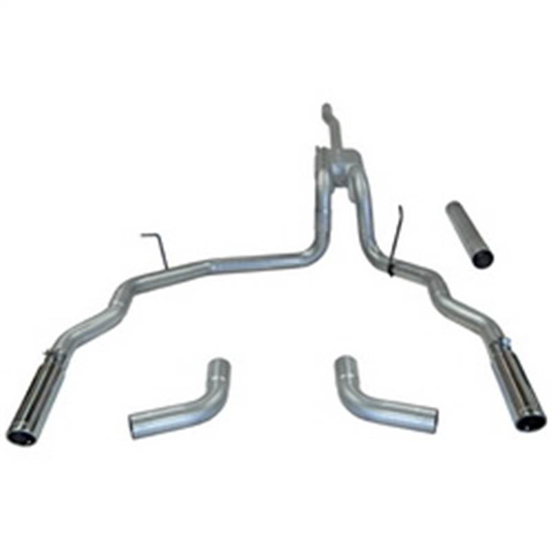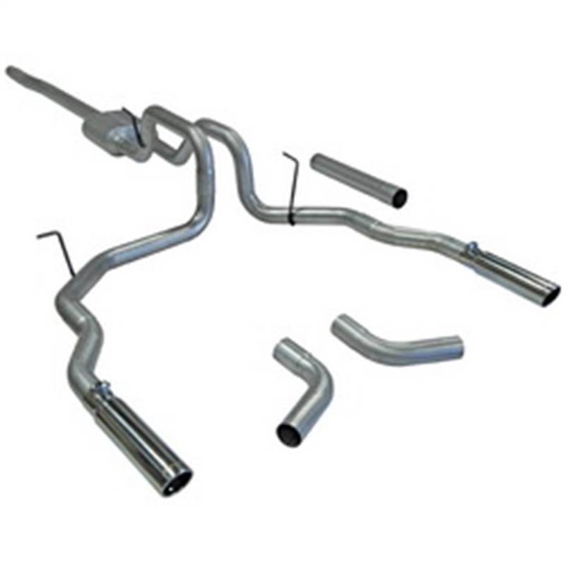 This Flowmaster American Thunder(R) cat-back exhaust system for the 2004-2008 Ford F-150 and Lincoln Mark LT trucks with the 4.6L or 5.4L engines is perfect for the person looking for a deep aggressive exterior sound with a moderate interior tone, and with all of the performance benefits that you would expect from Flowmaster(R). This bolt-on DOR/DOS (Dual Out Rear or Dual Out Side) emissions-legal exhaust system features 16-gauge mandrel-bent aluminized steel tubing flowing into a specially designed Super 40(TM) Series performance muffler with dual 2.50-inch aluminized steel tailpipes which use the factory hanger locations for an easy installation. The tailpipes exit either behind the rear wheels, which is ideal for towing, or straight out the back under the rear bumper for a muscular look. The system is finished off with a pair of large 3.00-inch polished stainless steel tips. The exhaust system is covered by our 3-year Limited Warranty and includes all necessary parts and hardware for an easy installation you can do at home. For those who prefer all stainless steel construction with a Lifetime Limited Warranty, check out exhaust system #817417. Note: Fits 2/4 wheel drive models all wheelbases.