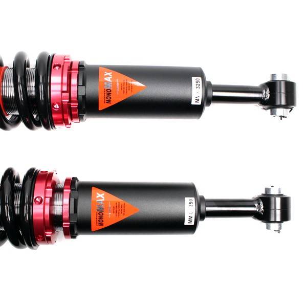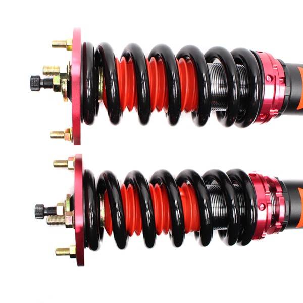 Godspeed Project's MAX is our premier single-adjustable coilover suspension kit. These coilovers are designed to be a streetable race built coilover at an affordable price. It features a monotube damper that is made out of a carbon seamless steel 52mm tube with a 44mm internal piston providing maximum damper response. The cold-bent springs are made from high strength SAE9252 steel to optimize the balance between performance and comfort. Using high quality shock oil made in Italy, Godspeed Project can guarantee exceptional damper performance at any temperature on and off the track. The top of the shock is attached to the car using a high quality top hat that features a high performance bearing pillow ball mount (when applicable). The bottom shock brackets are made out of a T7075 forged aluminum or carbon steel brackets for lighter weight without sacrificing durability which also includes brake line brackets (when applicable). The MAX offers 40 level of damper adjustability which can be set to your preference.