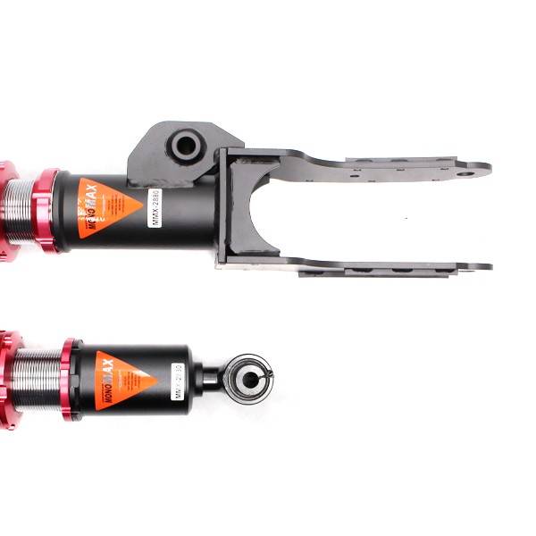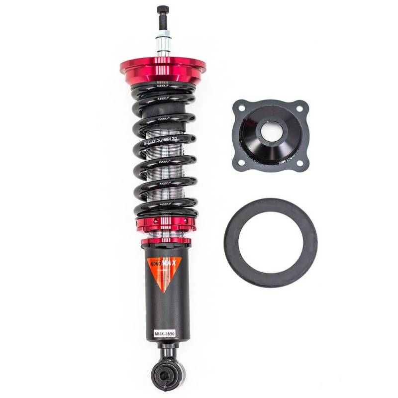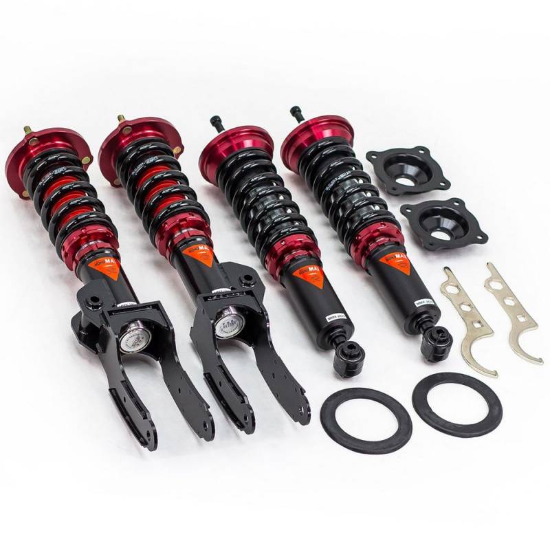 Godspeed Project's MAX is our premier single-adjustable coilover suspension kit. These coilovers are designed to be a streetable race built coilover at an affordable price. It features a monotube damper that is made out of a carbon seamless steel 52mm tube with a 44mm internal piston providing maximum damper response. The cold-bent springs are made from high strength SAE9252 steel to optimize the balance between performance and comfort. Using high quality shock oil made in Italy, Godspeed Project can guarantee exceptional damper performance at any temperature on and off the track. The top of the shock is attached to the car using a high quality top hat that features a high performance bearing pillow ball mount (when applicable). The bottom shock brackets are made out of a T7075 forged aluminum or carbon steel brackets for lighter weight without sacrificing durability which also includes brake line brackets (when applicable). The MAX offers 40 level of damper adjustability which can be set to your preference.