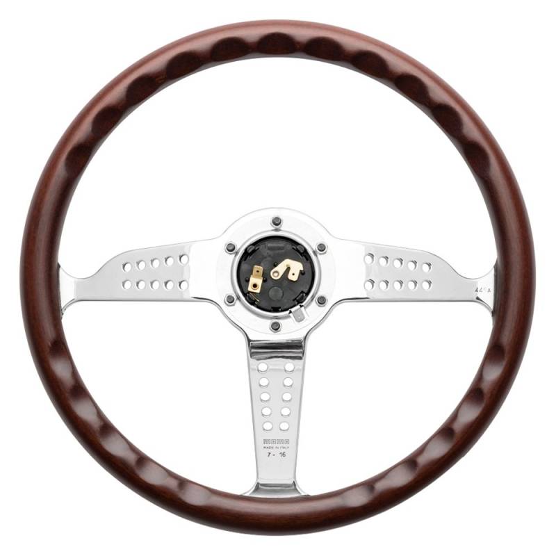 SUPER GRAND PRIX, Mahogany wood, walnut matte finishing, chrome spokes, Pre-drilled (6), Not Airbag Compatible, Diameter 350mm, Dish 37mm, Grip Section 27mm x 26mm, Spoke Color Chrome.