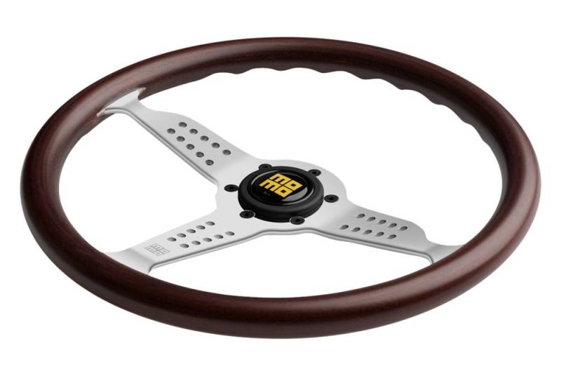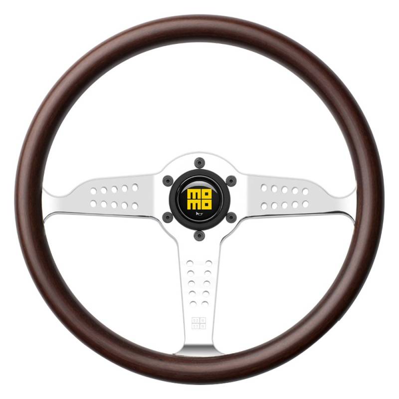 MOMO - GRA35WD0P - SUPER GRAND PRIX, Mahogany wood, walnut matte finishing, chrome spokes, Pre-drilled (6), Not Airbag Compatible, Diameter 350mm, Dish 37mm, Grip Section 27mm x 26mm, Spoke Color Chrome.