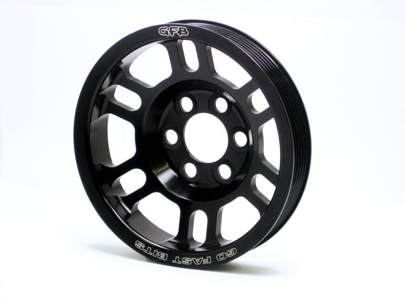 GO FASTER ? ADD LIGHTNESS. GFB's Lightweight Pulley Kits offer sharper throttle response and faster acceleration by significantly reducing the rotating mass at the engine.; Made from a single billet of 6061-T6 aluminium, then precision CNC machined to exacting tolerances, our pulley kits offer an exceptional bolt-on performance advantage without the need for supporting mods or tuning.; In some vehicle applications additional performance benefits are available at high RPM by underdriving the accessories (slowing them down), which reduces the parasitic load on the engine. All underdriven kits are thoroughly tested to ensure that the benefit comes without compromising the accessory performance.; It might be hard to imagine how reducing the mass of a pulley makes a car go faster, but accelerating a heavy factory pulley from say 3000-7000 RPM in a second or two saps a measurable amount of torque. GFB Lightweight Pulleys reduce inertia by up to 85 percent, so most of the torque that used to accelerate the pulley can now be applied to the wheels.