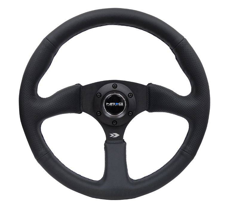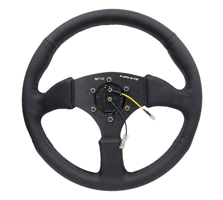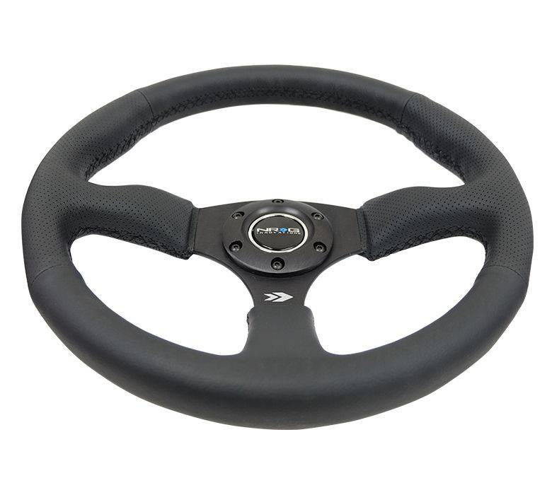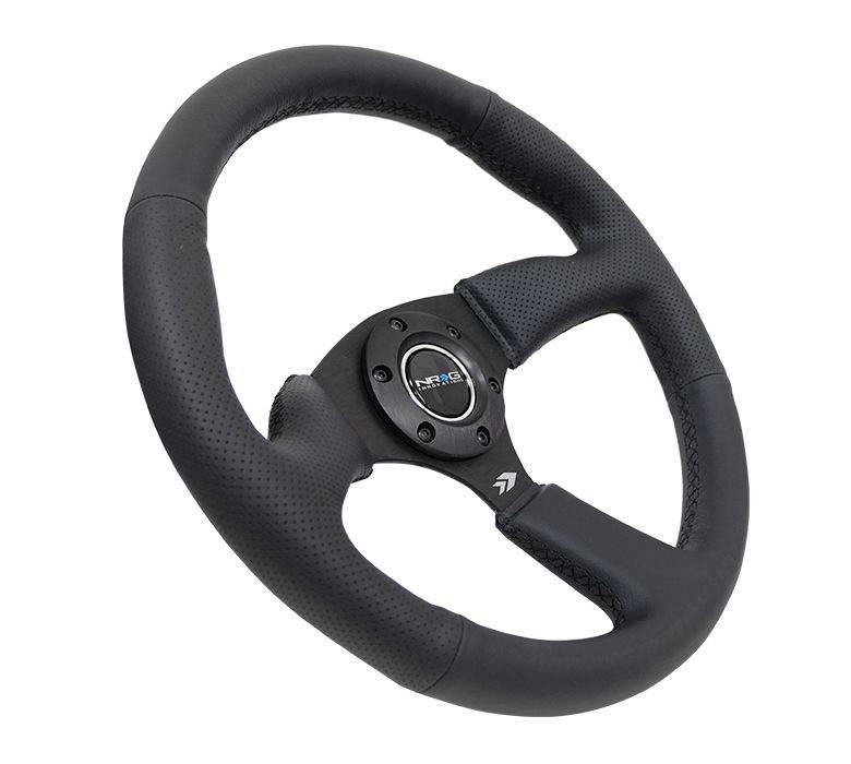 NRG Innovations Reinforced Steering Wheel (350mm / 2.5in. Deep) Blk Leather Comfort Grip w/5mm Matte Blk Spokes