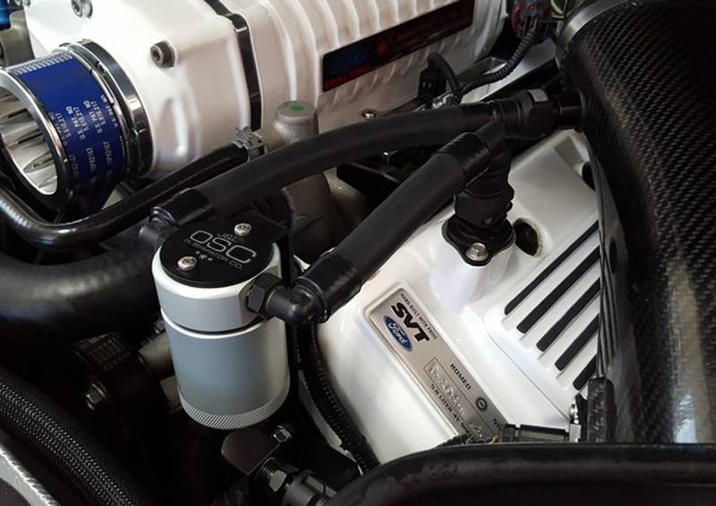 During the process of venting crankcase pressure back through your intake track, large amounts of oil, in the form of vapors can gather/accumulate in your intake tube, intake manifold runners and even dilute your gas, lowering its octane level. This happens on all engines and is even worse with forced inducted vehicles (supercharged and turbocharged) as crankcase pressures are increased. To combat this, we have developed an oil separator of our own design. Milled from solid billet aluminum this is a rock-solid piece. It has a knurled tank base for easy removal to drain the spent oil and an O-ring seal to prevent any leaks.