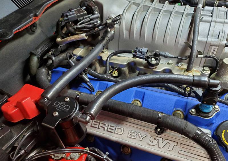 During the process of venting crankcase pressure back through your intake track, large amounts of oil, in the form of vapors can gather/accumulate in your intake tube, intake manifold runners and even dilute your gas, lowering its octane level. This happens on all engines and is even worse with forced inducted vehicles (supercharged and turbocharged) as crankcase pressures are increased. To combat this, we have developed an oil separator of our own design. Milled from solid billet aluminum this is a rock-solid piece. It has a knurled tank base for easy removal to drain the spent oil and an O-ring seal to prevent any leaks.
