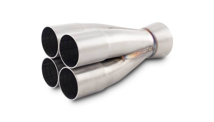 Vibrant Performance 4-1 Merge Collectors have a single slip design ideal for naturally aspirated applications, featuring precise cut mandrel bent 304 Stainless Steel tubing with high quality TIG welded construction. Vibrant merge collector expanded inlets are designed to fit perfectly with Vibrant Stainless Steel piping. 4-1 Merge collectors range from 1.75" to 2.25" for inlet, and 2.5" to 4" outlet sizes.