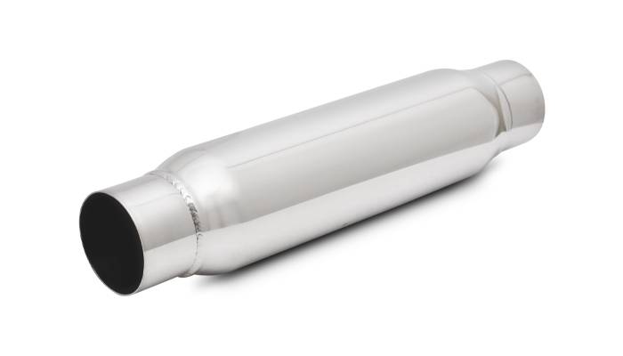 Vibrant Performance standard bottle style resonators are round bodied, densely packed with our premium multi-layered sound absorption materials, and manufactured from 304 stainless steel for optimum durability and corrosion resistance. Vibrant Performance standard bottle style resonators have a sleek design that is optimal for easy installation and work to maximize the reduction of exhaust db levels. They are available in 12" & 18" overall lengths and inlet I.D. diameters ranging from 2.25" to 4".