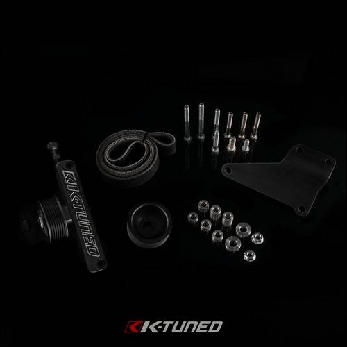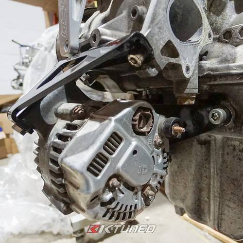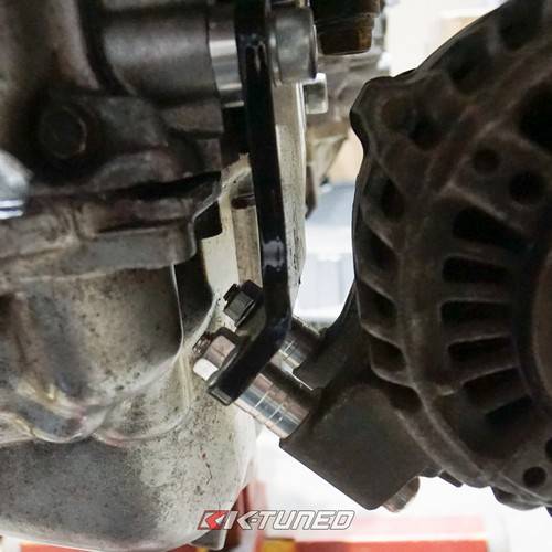The K-Tuned A/C & P/S Eliminator Kit deletes A/C, P/S and the factory belt tensioner from the engine. The alternator is then relocated lower and moves to the original A/C location, to increase clearance on even the tightest K-swap chassis. This part is particularly useful for EF K-swaps because it offers some much needed headlight clearance. If you want, you can even cut off the mounting tab that was used for the original tensioner. Doing this, allows ITB๏ฟฝs and custom intake manifolds to be fitted very easily.