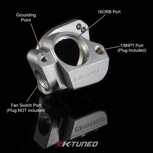 The K-Tuned B/D Thermostat Housing was developed to offer B and D Series engine owners a few more options with their cooling system setups. The CNC machined billet housing is a direct replacement for the oem unit and mounts in the same factory position, with the rad outlet following the original and slightly upward outlet angle. The number one feature of this design is the threaded water outlet port on the body, which allows use of the standard 1.25" rad hose fitting or 12AN / 16AN fittings if desired. This unique threaded port design eliminates the need to weld bungs to the old and dirty factory cast aluminum pieces. The rad hose fitting thread size is 16OR (1-5/16-12 SAE) and is properly sealed in an o-ring port to ensure leak-free operation. The housing also has two additional ports on it, one for the fan switch and one 1/8 NPT accessory port for gauges etc. Note that we do include a plug for the 1/8 NPT port, just in case the port is not used. We even machined and threaded the M6 hole for the important ground ring found on the engine harness. Installation is very simple, the housing is located right beside the intake manifold and held in place with only two bolts. You'll notice that we have two different top hole locations, these allow the housing to fit all 1988-2001 Honda B-Series engines and all 1988-2000 D-Series engines. The K-Tuned B/D Thermostat Housing is not just a functional piece, it will also add a very nice touch to any engine bay.