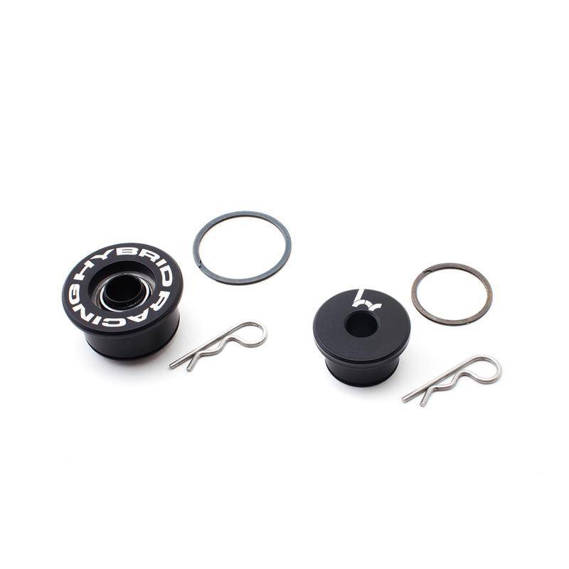 Replace rubber bushing with 6061 Aluminum. Black Anodized and Laser Etched Finish. Chrome-Plated Steel Spherical Bearing. Installs in less than 30min. The Hybrid Racing shifter cable bushings are a cost-effective, simple way to add that crisp feel that you associate with a solid feeling shifter. Don't be fooled into thinking that all shifter cable bushings are created equal. Many companies make the mistake of assuming both bushings used in stock shifter cables can be replaced with solid metal or Delrin bushing. However, this is not the case. Honda uses rubber bushings in their cables because it's a cost-effective way to allow 2-degrees of freedom. A solid metal or Delrin bushing allows only 1-degree of freedom. Generally speaking, eliminating a degree of freedom in the bushings translates into more effort required to shift and the potential to bend and ruin your shifter cables. That's why the Hybrid Racing shifter cable bushing incorporates a chrome-plated steel spherical bearing into their shifter bushings. This bearing gives a crisp, notchy feel you expect from shifter bushings without the extra effort required to shift, like other brands of bushings. All shifter bushings are supplied with spiral retaining rings to hold them into the cables, along with stainless steel cotter pins to hold the cables to the transmission. The bushings are constructed from 6061 aluminum and are black anodized, for added protection from corrosion. All shifter bushings are supplied with spiral retaining rings to hold them into the cables, along with stainless steel cotter pins to hold the cables to the transmission. The bushings are constructed from 6061 aluminum and are black anodized, for added protection from corrosion and finished off with a laser etched logo. Fits: 01-06 Honda Integra (RSX DC5) JDM Type R