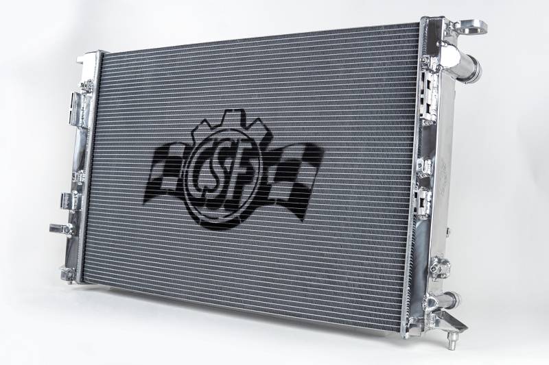 CSF has over 5 decades of experience manufacturing radiators. So when it comes to keeping your engine cool and your Audi running at its best a CSF High-Performance All-Aluminum Radiator is the obvious choice. Designed to perform on the street or at the track a performance radiator is a must-have for both high horsepower builds as well as race vehicles which need added cooling performance in motorsports environments. This radiator features a 2-Row core with CSF's exclusive B-Tube Technology: Unlike a regular oval shape "O" type radiator tube CSF uses a specially engineered tube in the shape of a "B". These "B-tubes" are carefully formed and then brazed over the seam to seal. CSF is able to use thinner and lighter aluminum material (with better cooling efficiency) because this design is actually stronger than normal "O" shape tubes that are welded. The design (inlet in the middle of the tube that is seam brazed) increases the heat transfer surface area of the tubes by approximately 15% over regular tubes - producing the efficiency of two smaller tubes vs. one large tube within the same space criteria. With "B-tubes" you are able to get "dual liquid laminar flow". CSF also uses ultra efficient multi louvered fins that are carefully and precisely aligned to maximize airflow through each radiator core. Fin specifications are carefully measured and calculated for each application and tested for maximum heat rejection efficiency in our wind-tunnel lab.; The CSF Audi radiator is a true "Drop-in fit" design requiring no modifications to install. OE style brackets are all CNC machined and welded for the best durability possible. Inlet/Outlet connections are designed to match the OE connections so you can reuse OEM hoses or aftermarket. In addition CSF has added an upgraded plate-type transmission oil cooler to the left side tank for improved transmission cooling in vehicles with automatic transmissions (comes pre-plugged for use in manual transmission vehicles).