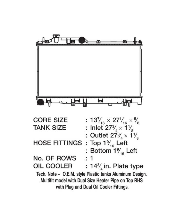 Tech Note: O.E.M. style Plastic tanks & Aluminum core;Multifit model with Dual Size Heater Pipe on Top RHS with Plug & Dual Oil Cooler Fittings.