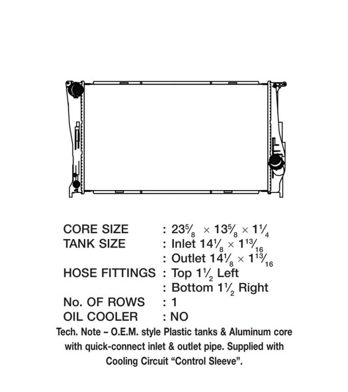 Tech Note: O.E.M. style Plastic tanks & Aluminum core;with quick-connect inlet & outlet pipe;Supplied with Cooling Circuit "Control Sleeve".