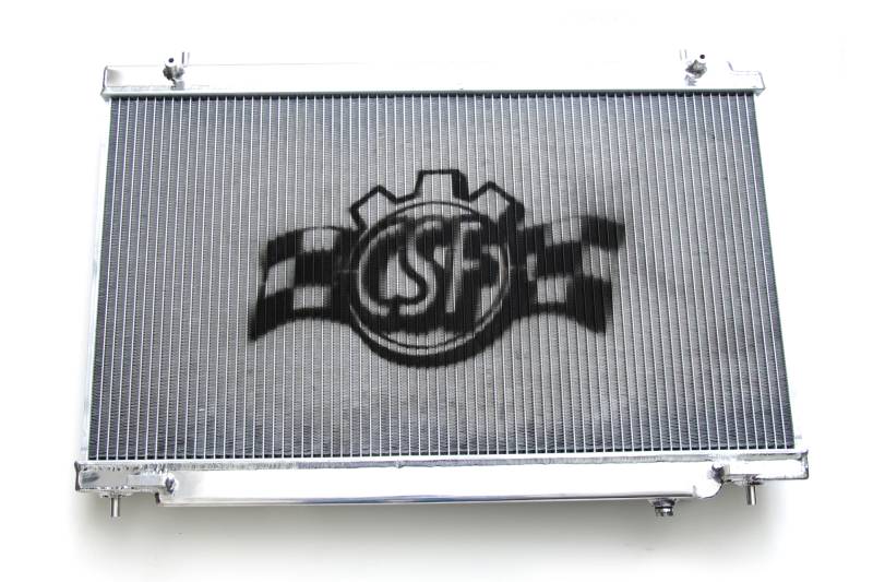 CSF has over 5 decades of experience manufacturing radiators. So when it comes to keeping your engine cool and your 350Z running at its best a CSF High-Performance All-Aluminum Radiator is the obvious choice. Designed to perform on the street or at the track a performance radiator is a must-have for both high horsepower builds as well as race vehicles which need added cooling performance in motorsports environments. This radiator features a 2-Row core with CSF's exclusive B-Tube Technology: Unlike a regular oval shape "O" type radiator tube CSF uses a specially engineered tube in the shape of a "B". These "B-tubes" are carefully formed and then brazed over the seam to seal. CSF is able to use thinner and lighter aluminum material (with better cooling efficiency) because this design is actually stronger than normal "O" shape tubes that are welded. The design (inlet in the middle of the tube that is seam brazed) increases the heat transfer surface area of the tubes by approximately 15% over regular tubes - producing the efficiency of two smaller tubes vs. one large tube within the same space criteria. With "B-tubes" you are able to get "dual liquid laminar flow". CSF also uses ultra efficient multi louvered fins that are carefully and precisely aligned to maximize airflow through each radiator core. Fin specifications are carefully measured and calculated for each application and tested for maximum heat rejection efficiency in our wind-tunnel lab.; The CSF 350Z radiator is a true "Drop-in fit" design requiring no modifications to install. OE style brackets are all CNC machined and welded for the best durability possible. Inlet/Outlet connections are designed to match the OE connections so you can reuse OEM hoses or aftermarket. Trust the cooling experts at CSF for the best performing highest-quality and most reliable radiators.
