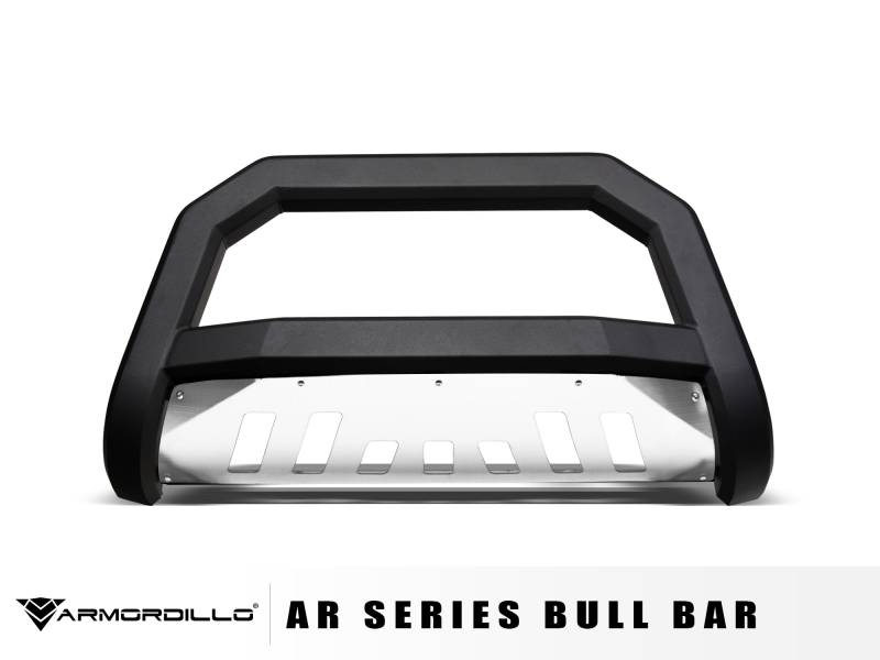Armordillo AR Series Bull Bar, If you're looking to protect the front end of your rig against the elements and impact of minor collisions without sacrificing the look of your new stylish front grille, the AR series bull bar with its aggressive angular design is just the thing you need. Unlike regular tubular bull bars, Armordillo AR series bull bars will not hide your front grille or a large portion of your front bumper, while keeping the front-end protection at a high level. Plus, the mesh styled skid plate doesn't restrict airflow to the radiator and engine preventing its overheating. Arm your off-road beast with Armordillo, an industry-leading manufacturer of top-of-the-line truck accessories and parts. Years of ingenious engineering and passion for the world's toughest trucks has been poured out into providing hardcore off-road products designed to turn your beefy companion into the embodiment of sleekness, edginess, and aggression. Armordillo offers bull bars, step bars, fender flares, truck bed rails, trailer hitches and some of its unique products. Pre-Runner bumper guards, AR drop steps, lockers, and bull bars. You can count on Armordillo to bring you impeccably strong and durable parts combining brutal appeal with high-end elegance. The brand's bull bars, grilles, fender flares and side step bars are a sure way to instantly give your off-road warrior a more sharp, mean look along with unmatched comfort and protection against the rage of the trails. So, if you are looking to improve your vehicle's stance and fortify its defenses to own the dust with confidence, Armordillo is the answer to all your needs.