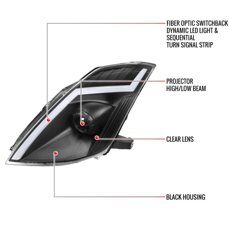 2006-2009 Nissan 350Z Switchback Sequential Turn Signal Animated LED Bar Projector Headlights (Matte Black Housing/Clear Lens)