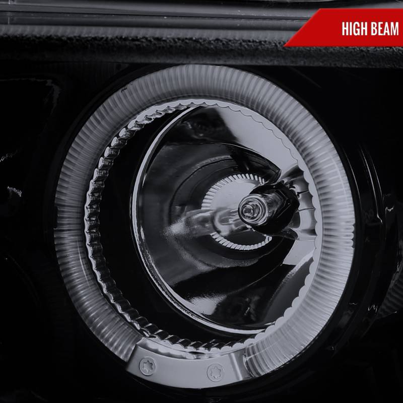 - Glossy black housing, smoke lens dual halo projector headlights with LED accent lights