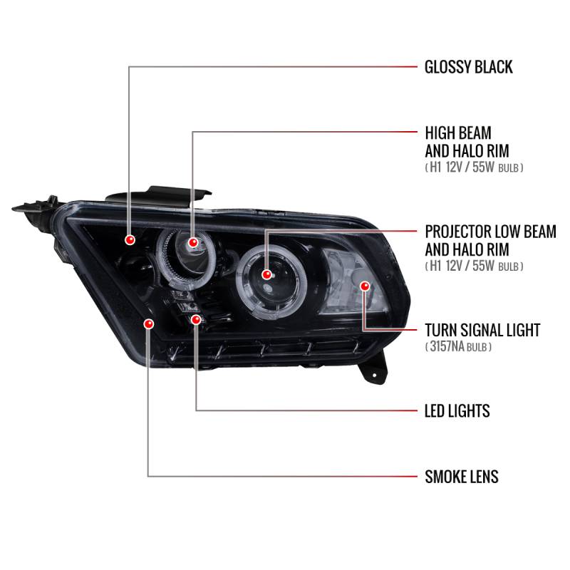 2010-2014 Ford Mustang Dual Halo Projector Headlights (Glossy Black Housing/Smoke Lens)
