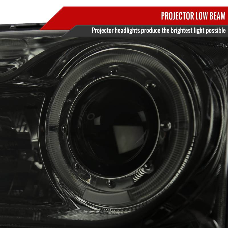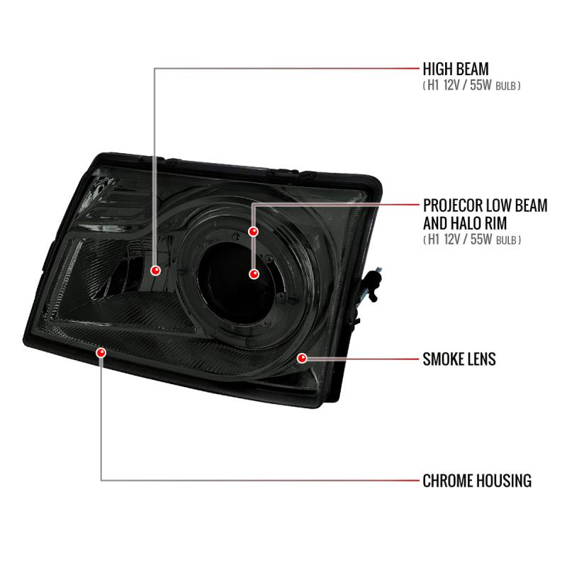 - Includes 1 pair ofchrome housing, smoke lens projector headlights with halo rim