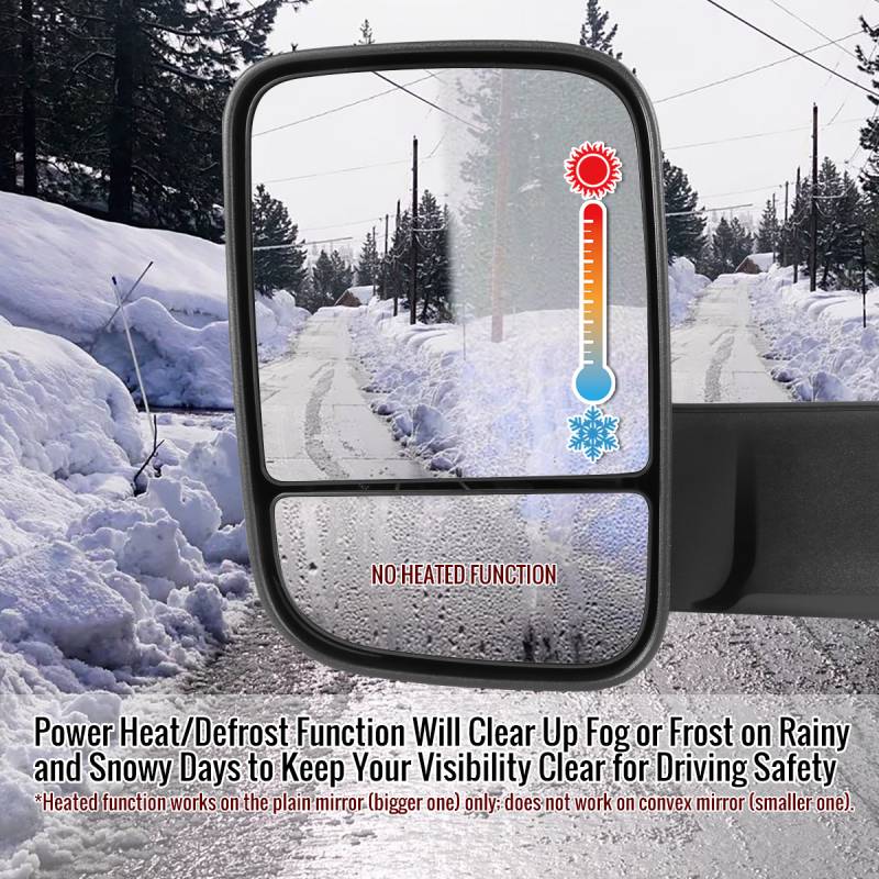 - Comes with (1) set (Both driver and passenger side) of power adjustable towing mirrors with manual telescoping function and amber lens LED turn signal lights