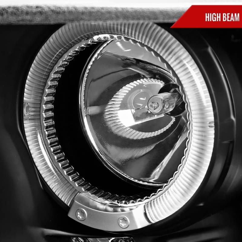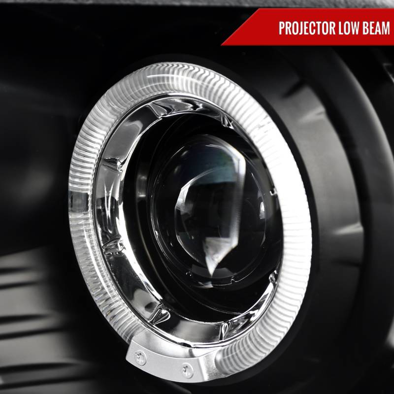 - Matte black housing, clear lens dual halo projector headlights with LED accent lights