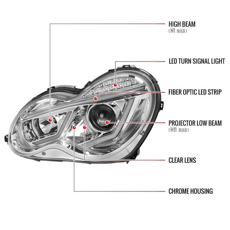 Spec-D 2001-2007 Mercedes Benz W203 C Class Sedan Projector Headlights w/ LED Light Bar & LED Turn Signal Lights (Chrome Housing/Clear Lens)