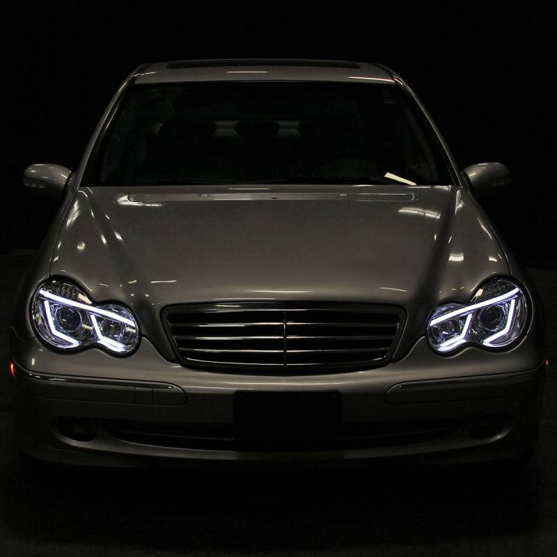 2001-2007 Mercedes Benz W203 C Class Sedan Projector Headlights w/ LED Light Bar & LED Turn Signal Lights (Chrome Housing/Clear Lens)