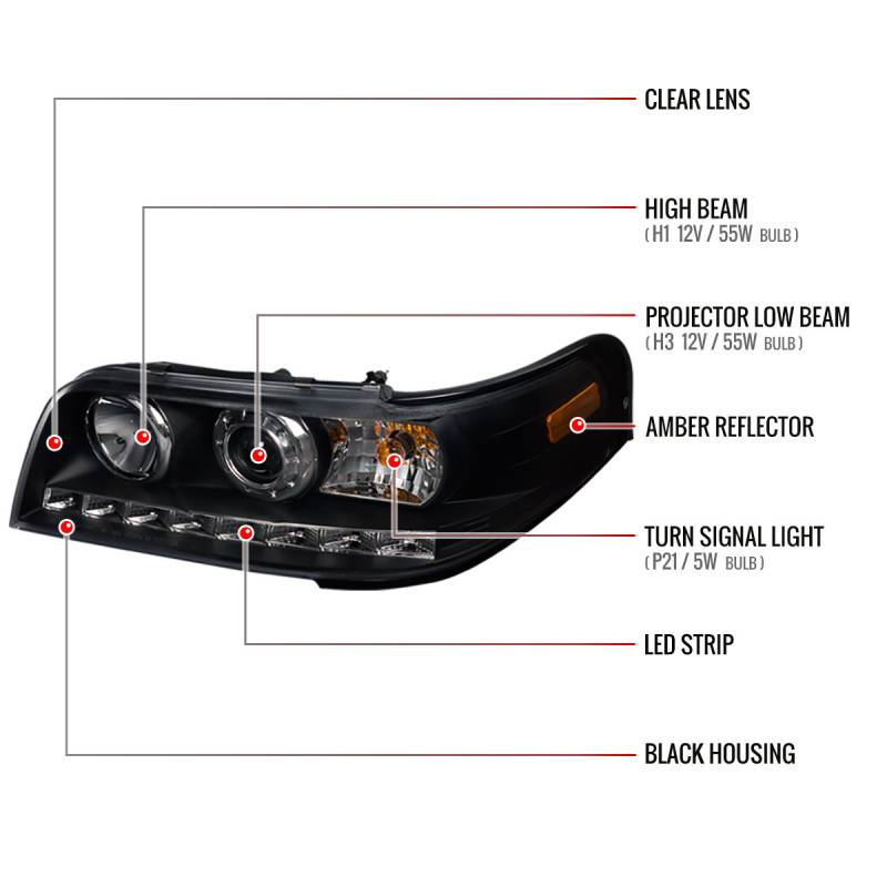 Spec-D 1998-2011 Ford Crown Victoria Projector Headlights w/ LED Light Strip (Matte Black Housing/Clear Lens)