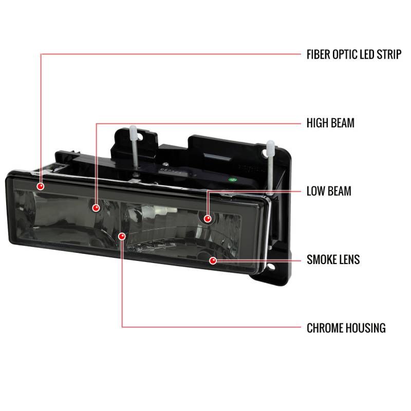 - Comes with (1) set of driver and passenger side factory style headlights with fiber optic LED strip in chrome housing with smoke lens