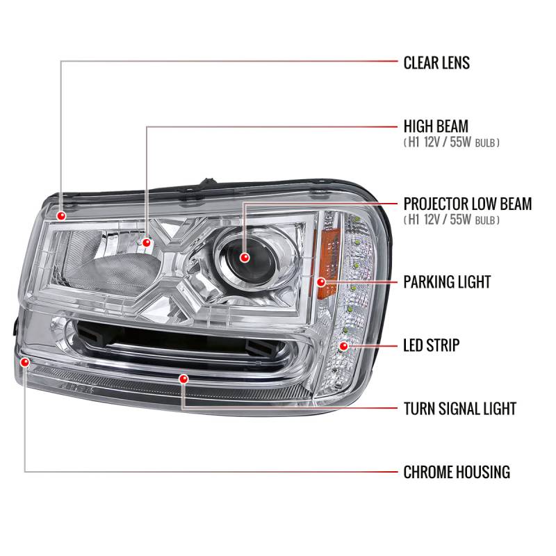 2002-2009 Chevrolet Trailblazer Projector Headlights w/ LED Light Strip (Chrome Housing/Clear Lens)