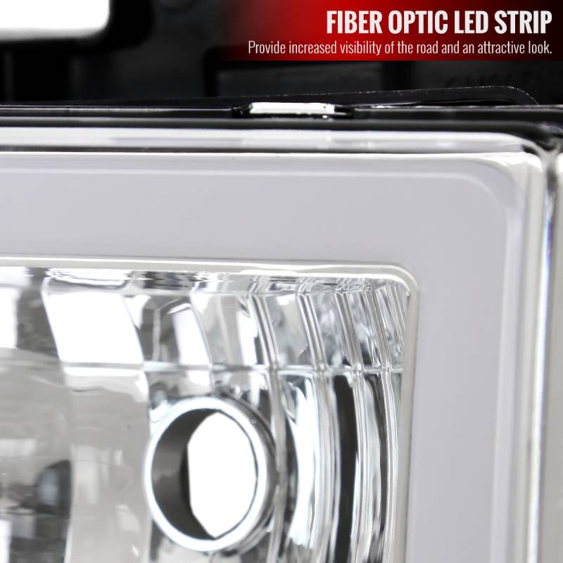 - Comes with (1) set of driver and passenger side factory style headlights with fiber optic LED strip in chrome housing with clear lens