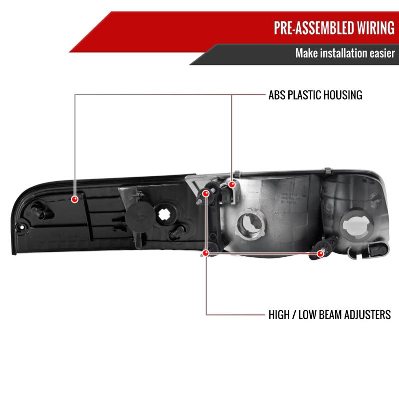 - Come 1 pair of black housing clear lens headlights + 1 pair of clear lens corner signal lights with amber reflector