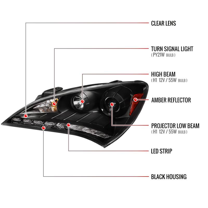 Spec-D 2010-2012 Hyundai Genesis Coupe Projector Headlights w/ SMD LED Light Strip (Matte Black Housing/Clear Lens)