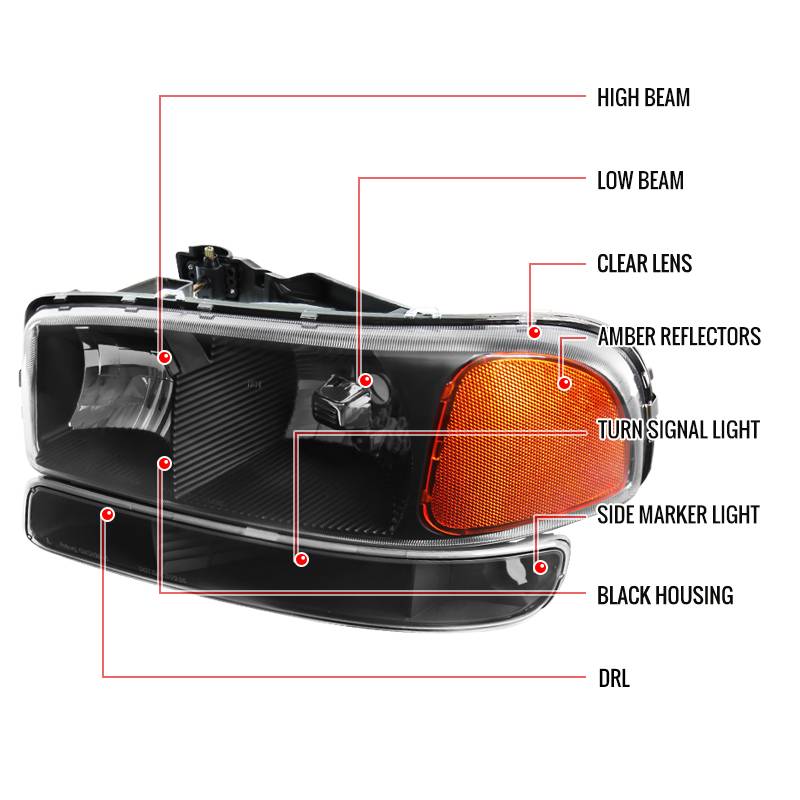 Spec-D 1999-2007 GMC Sierra/Yukon/Yukon XL Factory Style Crystal Headlights w/ Amber Reflector & Bumper Lights (Matte Black Housing/Clear Lens)